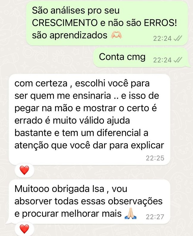 Ofereço um suporte individualizado via WhatsApp, para que você se sinta completamente apoiada e confiante em sua jornada de aprendizado!
